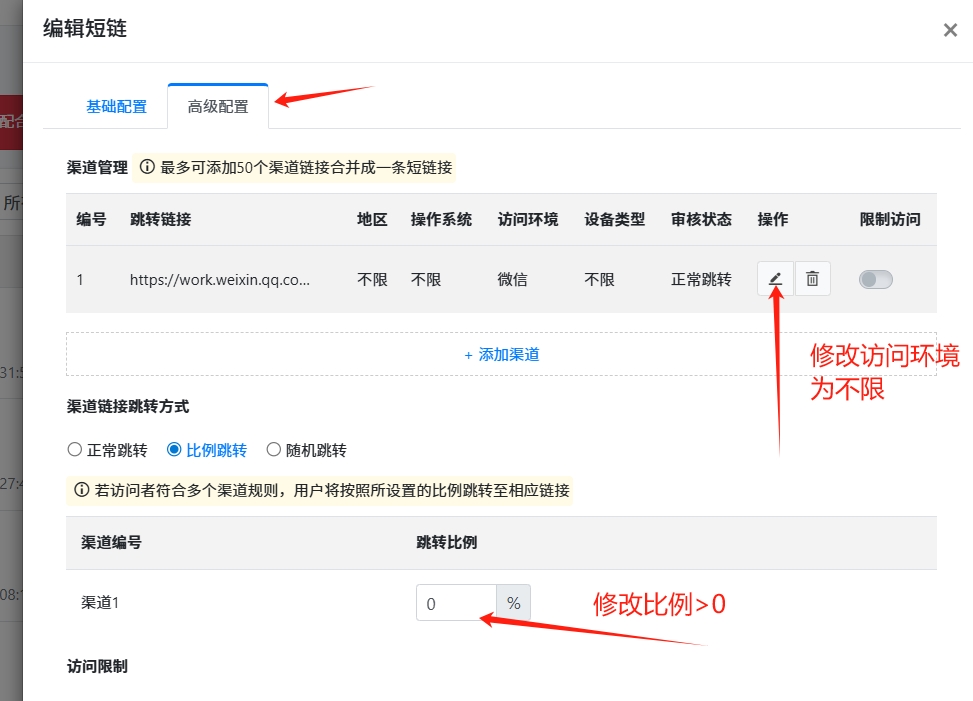 2. 解决方案:在短链的高级设置里,修改跳转的条件,使得跳转满足条件