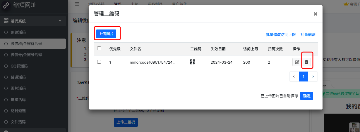 微信群二维码有7天有效期,如果过了7天,删除过期二维码,重新上传二维码